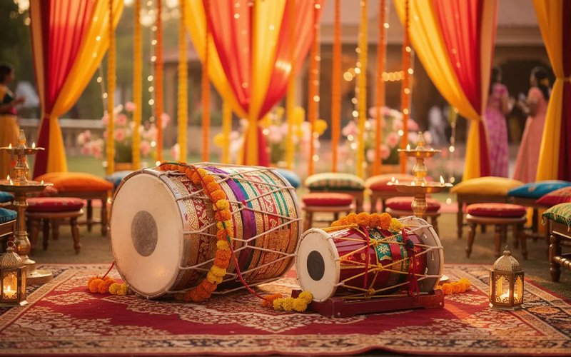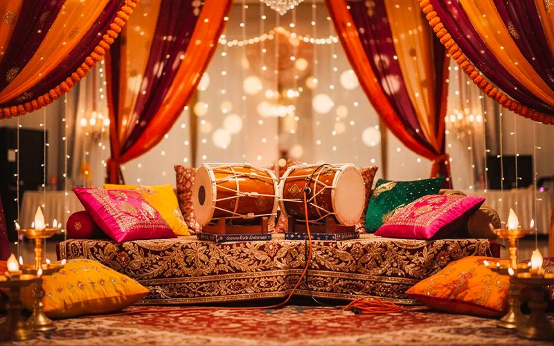 This setup is ideal for celebrations filled with music and tradition. It fits wedding ceremonies, pre-wedding events, cultural functions, and festive gatherings. The décor enhances mood and energy. Great for events that want rhythmic joy and lively moments.
